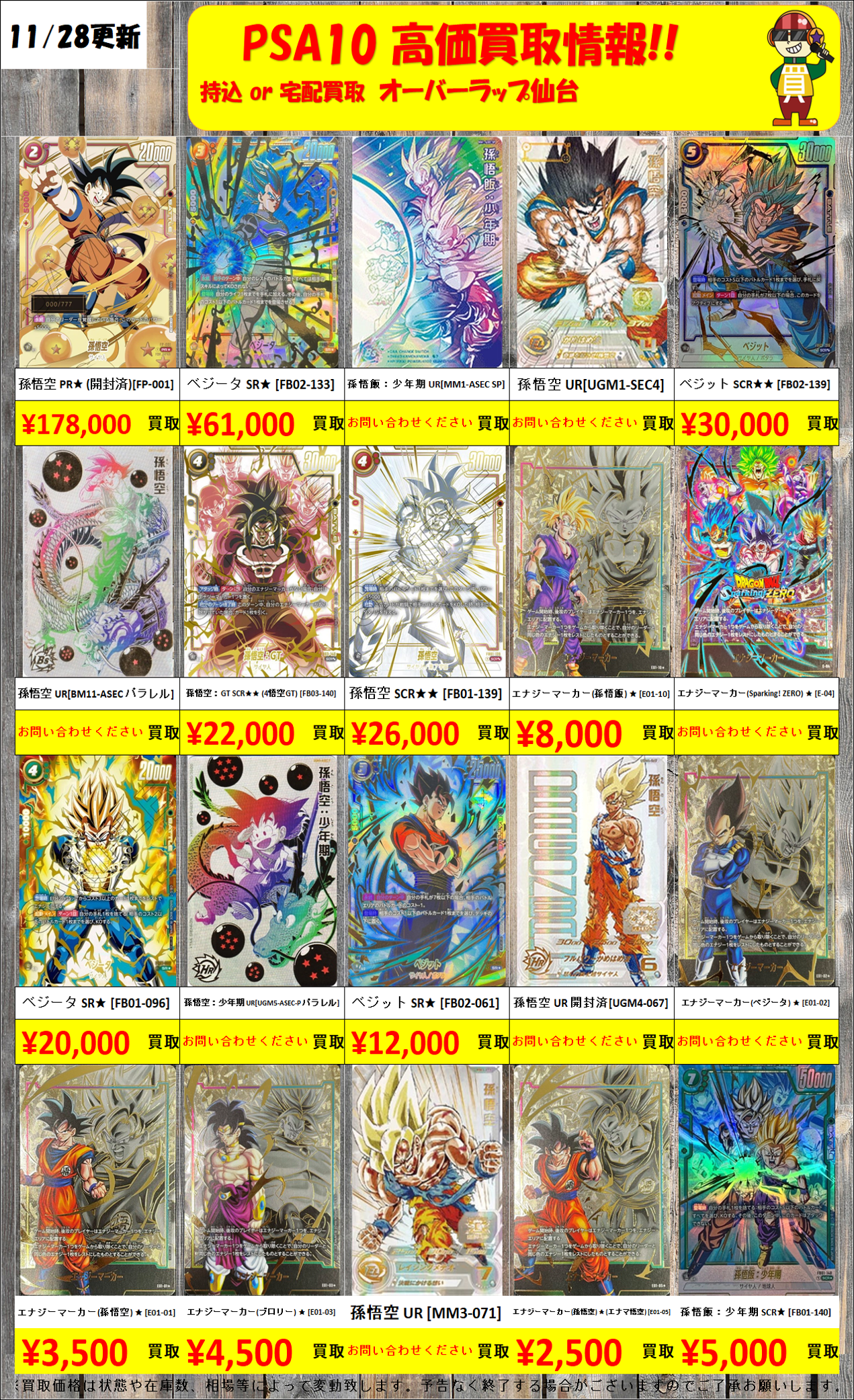 ドラゴンボールカードPSA10・素体買取価格表